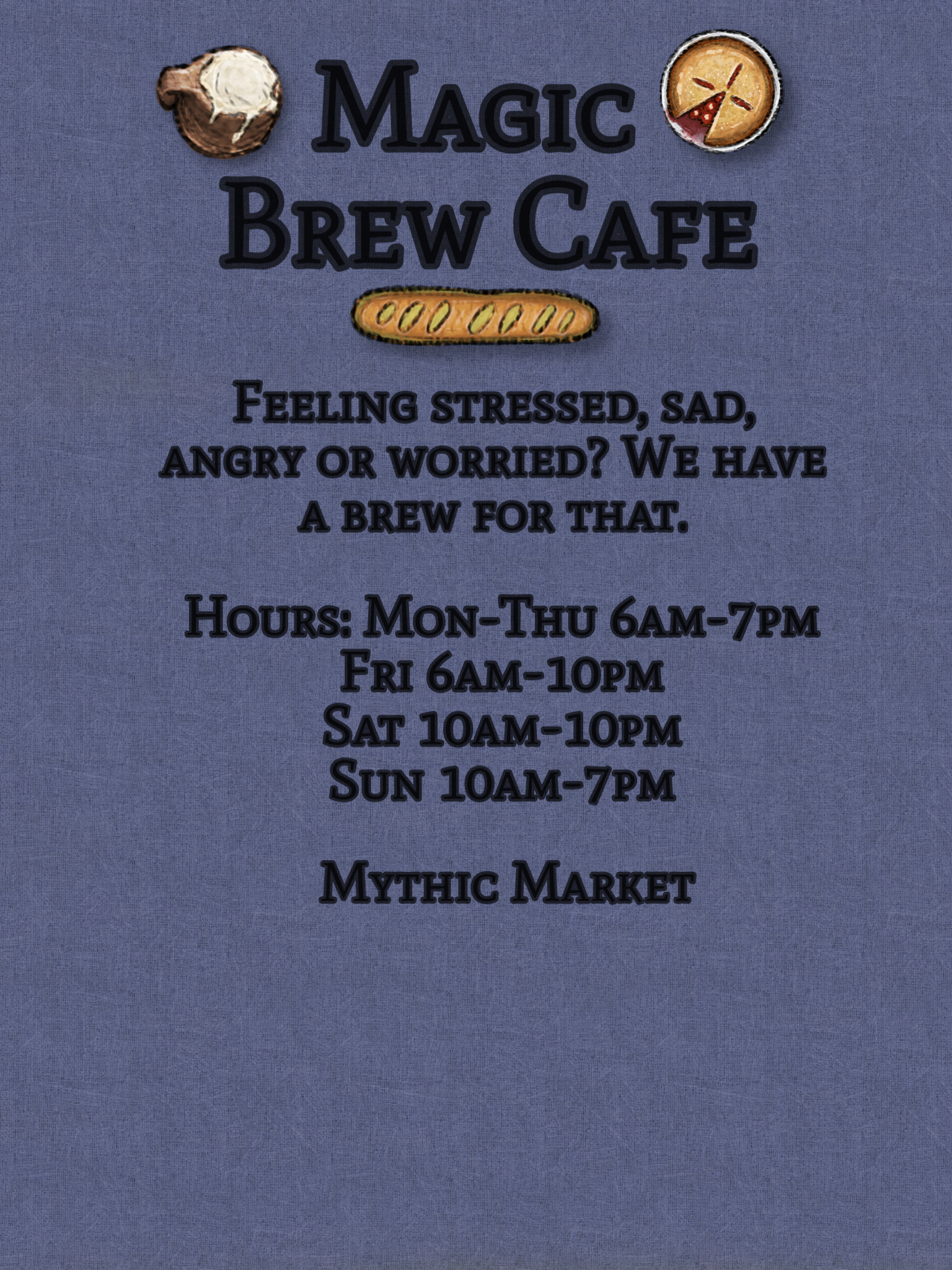 Miss Rumble’s Everything Shop: Anything you could want, we have it. If we don’t have it, we can get it. Stop by today for all your back to school needs. Mythic Market.